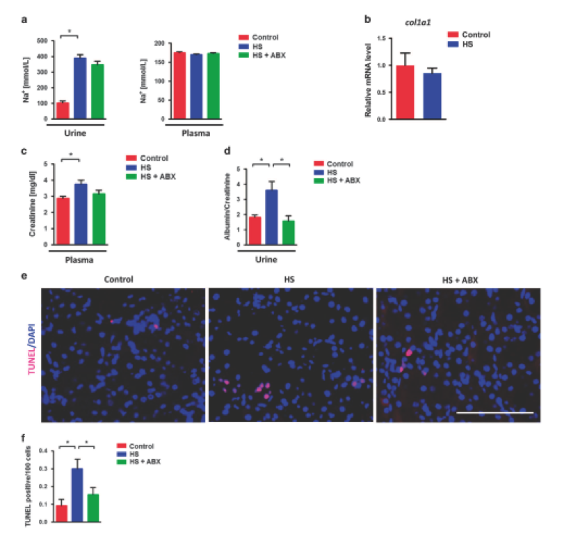 為了進一步闡明HS攝入后腸道生態(tài)失調(diào)和腎損傷之間的關(guān)系,給小鼠喂養(yǎng)多粘菌素B和新霉素??股亟o藥確實恢復(fù)了HS飼喂誘導(dǎo)的回腸Ifn-γ過表達,通過糞便白蛋白和FD-4滲透監(jiān)測腸道泄漏,以及通過血漿內(nèi)毒素水平和腎臟16s / 18s比率監(jiān)測的細菌移位,通過尿和血漿Na +濃度測量,抗生素不改變鈉負荷(圖5a)。雖然8周HS喂養(yǎng)并未引起纖維化等進展性腎損傷,但由col1a1 mRNA水平監(jiān)測(圖5b),HS喂養(yǎng)增加了血漿肌酐水平。更重要的是,與對照組小鼠相比,HS-喂養(yǎng)小鼠腎功能障礙的主要標(biāo)志物尿白蛋白/肌酐比率顯著增加,抗生素治療幾乎可以完全恢復(fù)腎功能(圖5d)。另外,TUNEL染色顯示抗生素施用可以降低HS誘導(dǎo)的凋亡細胞的升高(圖5e和f)。總之,該數(shù)據(jù)表明,抗生素治療能夠改善腸道滲漏和HS喂養(yǎng)引起的早期腎損傷。