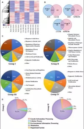 c)由于轉(zhuǎn)基因材料中過表達基因為bZIP家族轉(zhuǎn)錄因子及其活性激活基因家族,研究者重點關(guān)注了3個材料中轉(zhuǎn)錄上調(diào)的基因,這些基因被劃分為4類:Group1,XL22相較于CA1-OE特有上調(diào)基因,645個;Group2,XL22相較于SAPK6-OE特有上調(diào)基因,500個基因特異上調(diào);Group3,CA1-OE相較于SAPK6-OE特有上調(diào)基因,398個;Group4,SAPK6-OE相較于CA1-OE特有上調(diào)基因,869個。Group I主要分布在“Response to ABA”、“Regulation of Plant-type Hypersensitive response”等GO term;Group II主要分布在“Organic Substance Biosynthetic Process” 、“Salicylic Acid Biosynthetic Process” 、“Regulation of Hydrogen Peroxide Metabolic Process”等GO term;Group3主要分布在“Gene Expression and Regulation”、 “Nitrate Related Metabolic Process” 、 “Carbohydrate Biosynthetic Process” 等GO term;Group4主要分布在 “Cytokinesis and Cell Proliferation”、“Microtubule Related Process”、“Response to Abiotic Stress” 等GOterm(見圖6C)。因此推測,XL22中的兩個基因可能激活了不同的干旱脅迫應答基因。