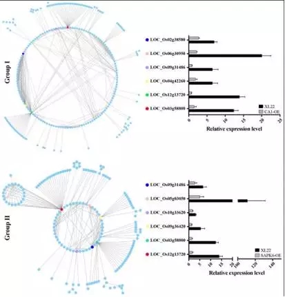 d)為了揭示GroupI 、Group2兩個基因集內(nèi)部的基因調(diào)控關(guān)系,研究者基于STRING數(shù)據(jù)庫分別繪制了上述兩個基因集內(nèi)部基因的蛋白互作網(wǎng)絡圖。如圖7所示,GroupI蛋白互作網(wǎng)絡中包含481個PPI(protein-protein intereaction,PPI),Group2中包含280個PPI。其中,有6個基因在蛋白互作網(wǎng)絡中均處于非常中心的位置(與之互作蛋白數(shù)量越多,越靠近中心位置)。其中,3個(LOC_Os12g13720, ?LOC_Os03g58800, ?LOC_Os09g31486) 在兩個蛋白互作網(wǎng)絡中均處于中心位置,分別編碼 PDR ABC transporter, a ATPase, and a DnaK/Hsp70s family protein,可能在干旱應答過調(diào)控網(wǎng)絡發(fā)揮著非常關(guān)鍵的;其他3個基因(Group1特異:LOC_Os04g42260 ?LOC_Os02g38580,Group2特異:LOC_Os05g03050)分別編碼protein phosphatase、Rad51、Hsp90 ,從功能可以看出,它們與水稻干旱應答同樣相關(guān)。