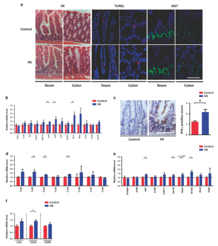 腸道生態(tài)失調(diào)通常與腸道病理生理學(xué)的改變有關(guān),研究人員檢查了慢性HS喂養(yǎng)對腸道變化的影響。在對照組和HS-喂養(yǎng)組小鼠的回腸和結(jié)腸上皮細胞形態(tài)沒有差異(圖3a)。此外,通過TUNEL和ki67染色鑒定的相似數(shù)量凋亡和增殖細胞表明,慢性HS喂養(yǎng)不影響腸道中的細胞死亡(圖3a)。然而,研究人員發(fā)現(xiàn)炎癥標(biāo)志物表達被慢性HS攝入顯著改變。特別是,Ccl4,Ccl5和Ifn-γ在HS小鼠的回腸中表現(xiàn)出更高的mRNA水平(圖3b)。 IFN-γ免疫組織化學(xué)在回腸中的結(jié)果證實了基因表達數(shù)據(jù)(圖3c)。由于TLR家族蛋白和Nf-κB是參與病原體相關(guān)免疫應(yīng)答的主要分子,進一步評估TLR家族和Nf-κB基因表達,發(fā)現(xiàn)TLR2,TLR3和TLR5mRNA水平在回腸中趨于更高(圖3d)。同時,HS處理后IRF7,GATA3和NFKB2的表達顯著上調(diào)(圖3e)。此外,HS喂養(yǎng)后白細胞中CD38的表達在回腸中升高(圖3f)。然后通過RNA測序進行轉(zhuǎn)錄組分析,并比較涉及“細胞因子 – 細胞因子受體相互作用”,“ NF-κB信號通路“和”Toll樣受體信號通路“。在回腸和結(jié)腸中,兩組之間許多基因的表達是不同的。總的來說,這些數(shù)據(jù)表明慢性HS攝入導(dǎo)致腸炎癥反應(yīng)中斷。