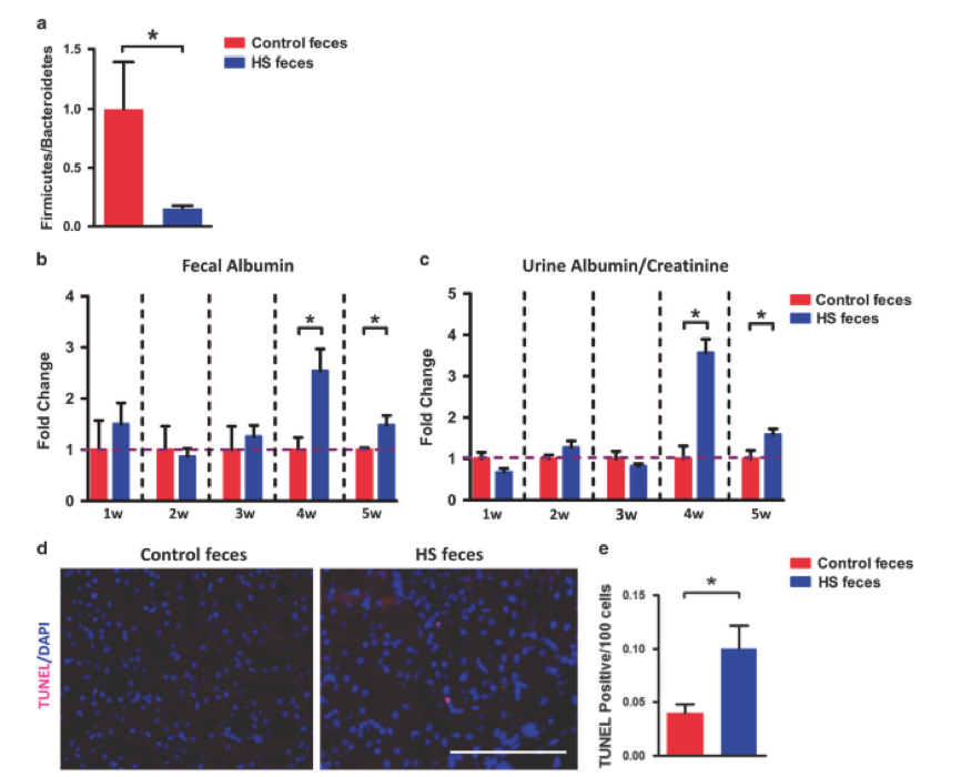 最后,為了進一步證明腸道微生物群是腎損傷發(fā)展的上游因素,進行了糞便微生物群移植實驗。喂食正常飲食(不是高鹽)的兩組小鼠口服來自對照和HS處理的小鼠的糞便。8周后,接受對照糞便的對照小鼠的盲腸壁Firmicutes/Bacteroidetes比例(其是微生物群組成改變的主要標(biāo)志)顯著高于接受HS糞便的HS小鼠,其為 與研究人員之前的數(shù)據(jù)一致,表明HS喂養(yǎng)降低了盲腸中的Firmicutes / Bacteroidetes比例,并證明該糞便微生物群移植實驗是成功的(圖7a)。此外,如圖7b和c所示,給藥后4周,由糞便白蛋白含量監(jiān)測的腸道通透性在接受HS喂養(yǎng)糞便的小鼠中顯著增加,并且重要的是,尿白蛋白/肌酸酐比率(目前研究中觀察到的腎功能障礙的主要表型)在移植后4周接受HS喂養(yǎng)的糞便的小鼠中也顯著增加。最后,與對照小鼠相比,HS糞便移植小鼠中腎臟凋亡細胞的數(shù)量顯著增加(圖7d和e)。這些數(shù)據(jù)進一步表明,HS喂養(yǎng)引起的腸道生態(tài)失調(diào)是腎損傷和功能障礙的原始誘因。